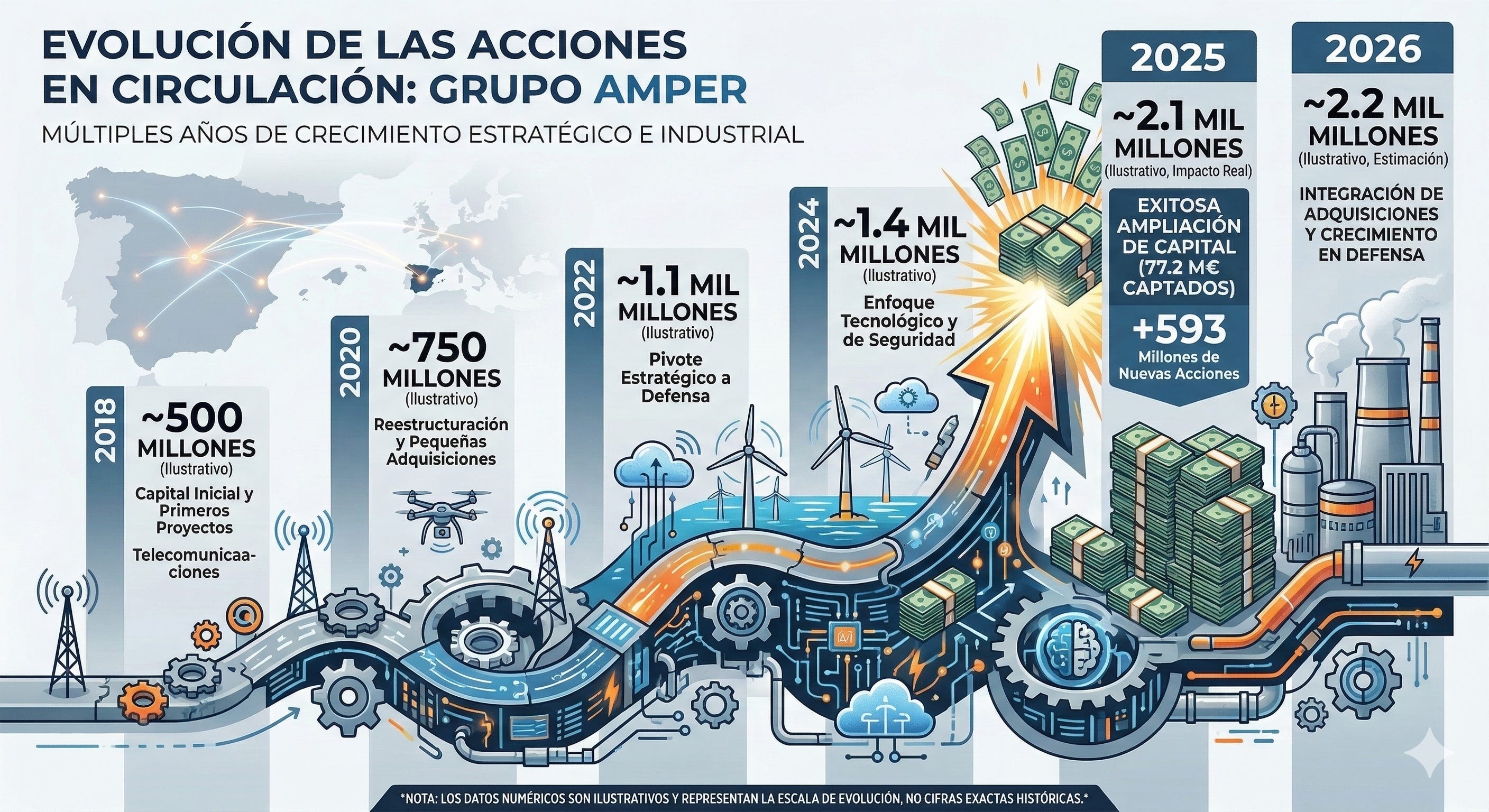 Historia y Evolución Reciente. El Grupo Amper es una multinacional española fundada en 1956, históricamente ligada al sector de las telecomunicaciones (filial de Telefónica). Tras atravesar graves dificultades financieras y un preconcurso de acreedores en la década pasada (2014-2015), la empresa ha experimentado una metamorfosis radical.
