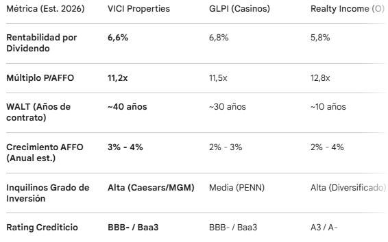Contratos generacionales: A cierre de 2025, el WALT de VICI es de 39,6 años. En el sector inmobiliario tradicional (oficinas o comercial), un buen contrato dura de 5 a 10 años. VICI tiene contratos firmados a décadas vista.