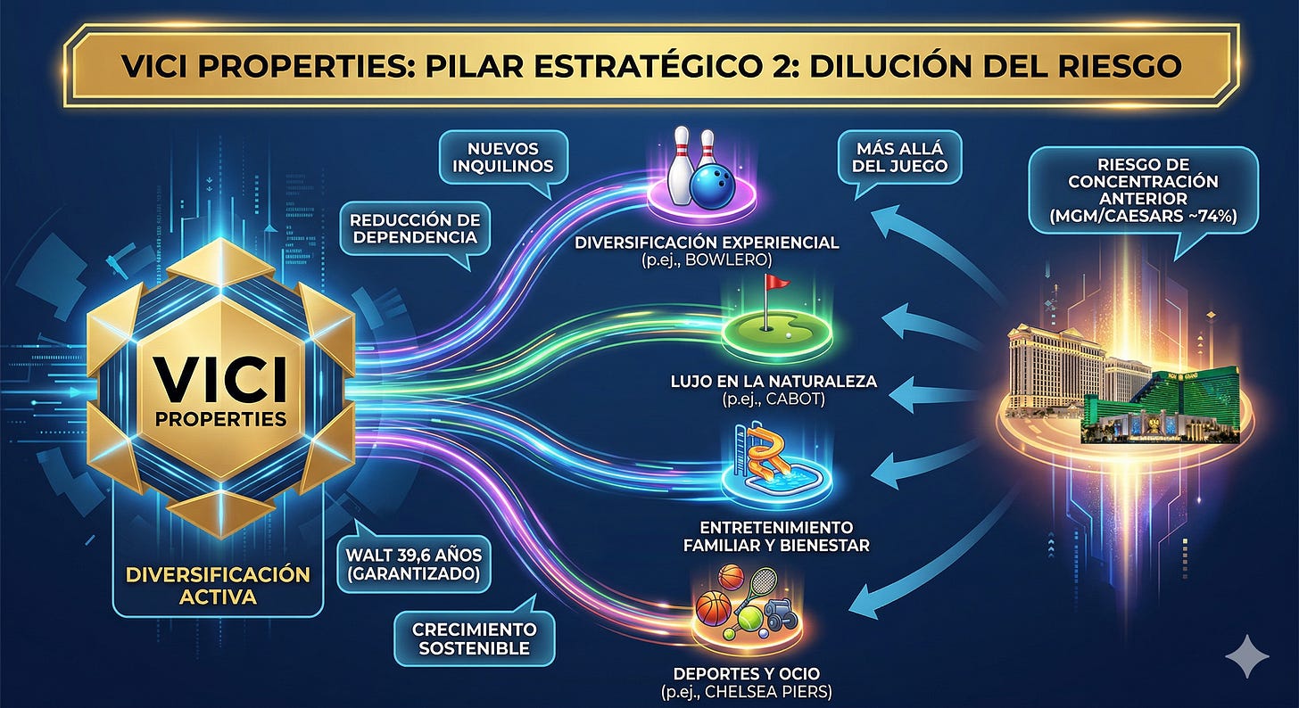 Expansión Experiencial. El gran objetivo estratégico actual es diversificar la cartera para diluir el riesgo de Caesars y MGM. VICI se está posicionando como el propietario de referencia para cualquier activo “experiencial” a gran escala. Esto incluye fuertes inversiones en: