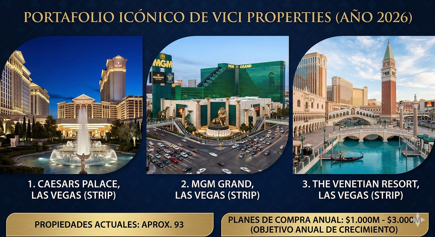 VICI no compra edificios de oficinas estándar ni centros comerciales genéricos; compran propiedades que son imposibles de replicar hoy en día.